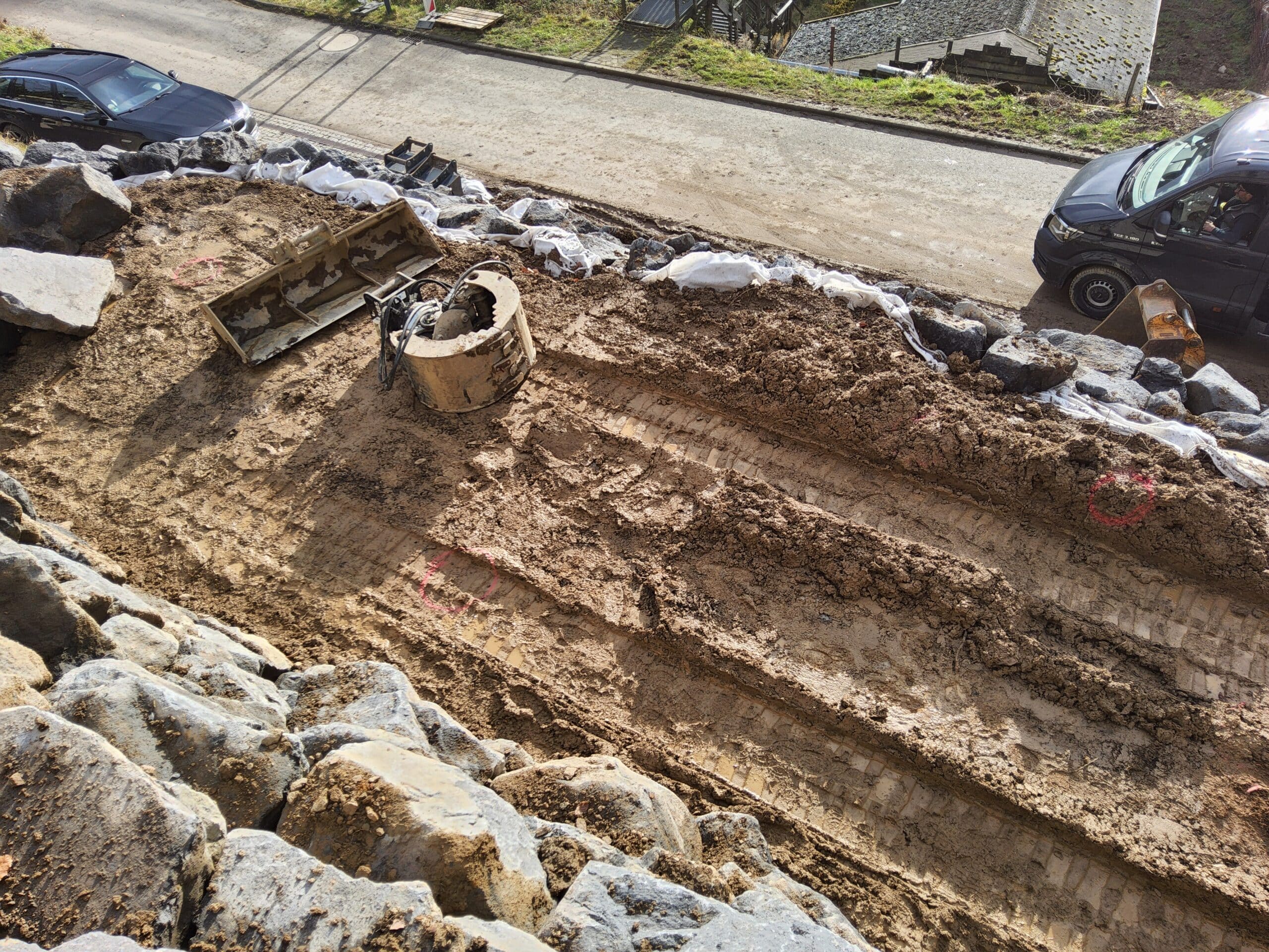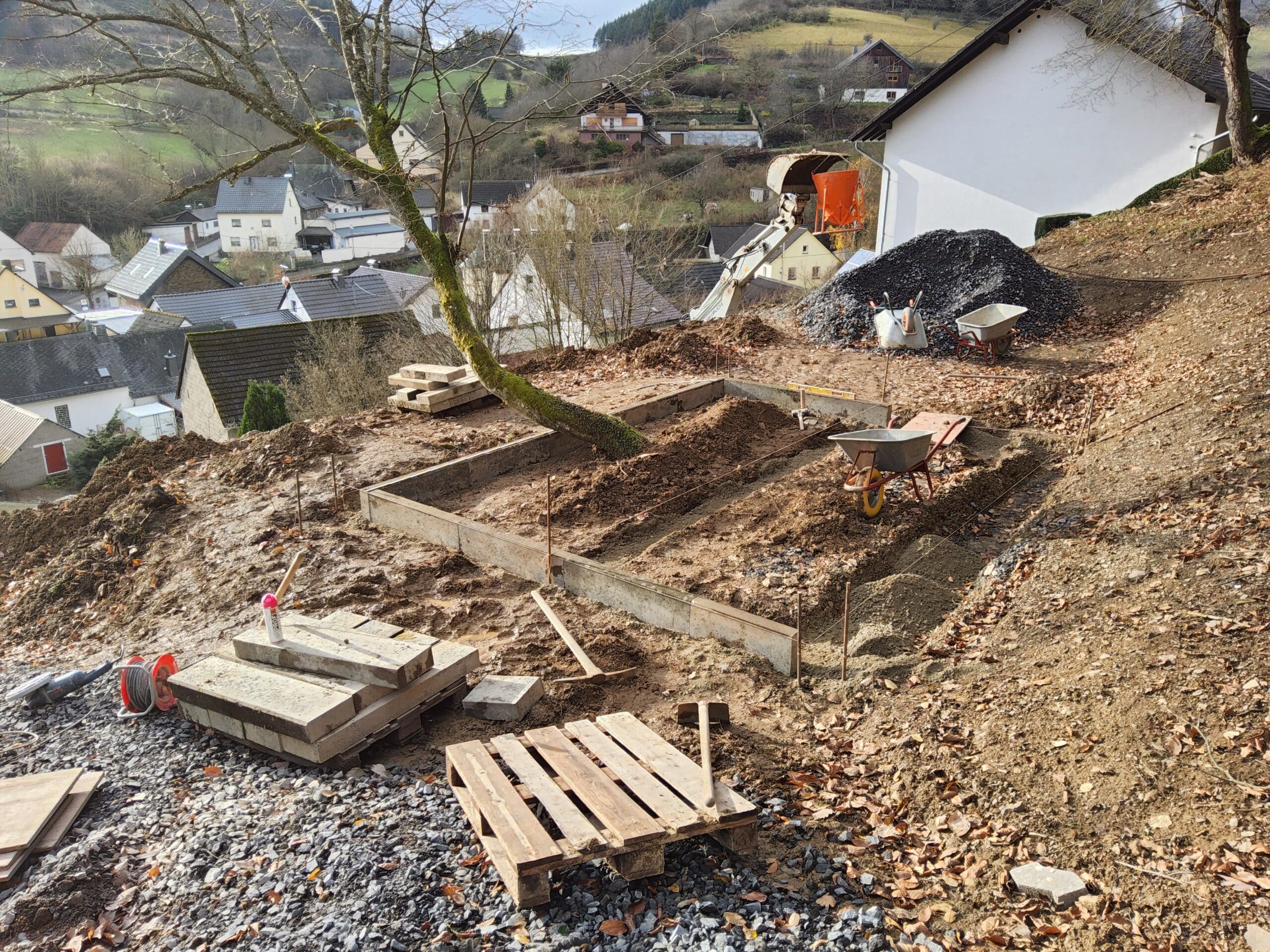 Dieses spannende Projekt an einem bestehenden Einfamilienhaus in Acht wird in mehreren Bauabschnitten realisiert. Im ersten, bereits abgeschlossenen Abschnitt lag der Fokus auf der Sicherung, Terrassierung und Bepflanzung der weitläufigen Hangfläche des Grundstücks.