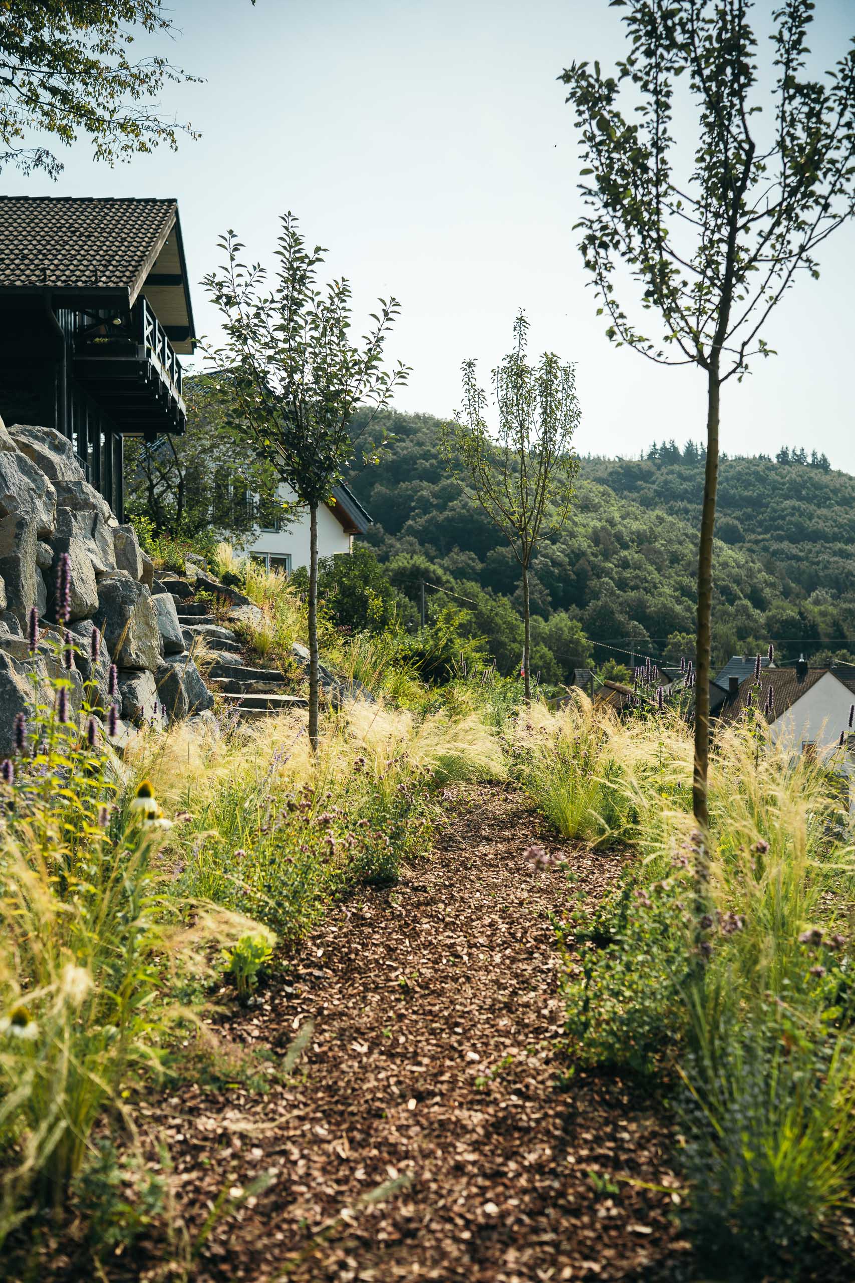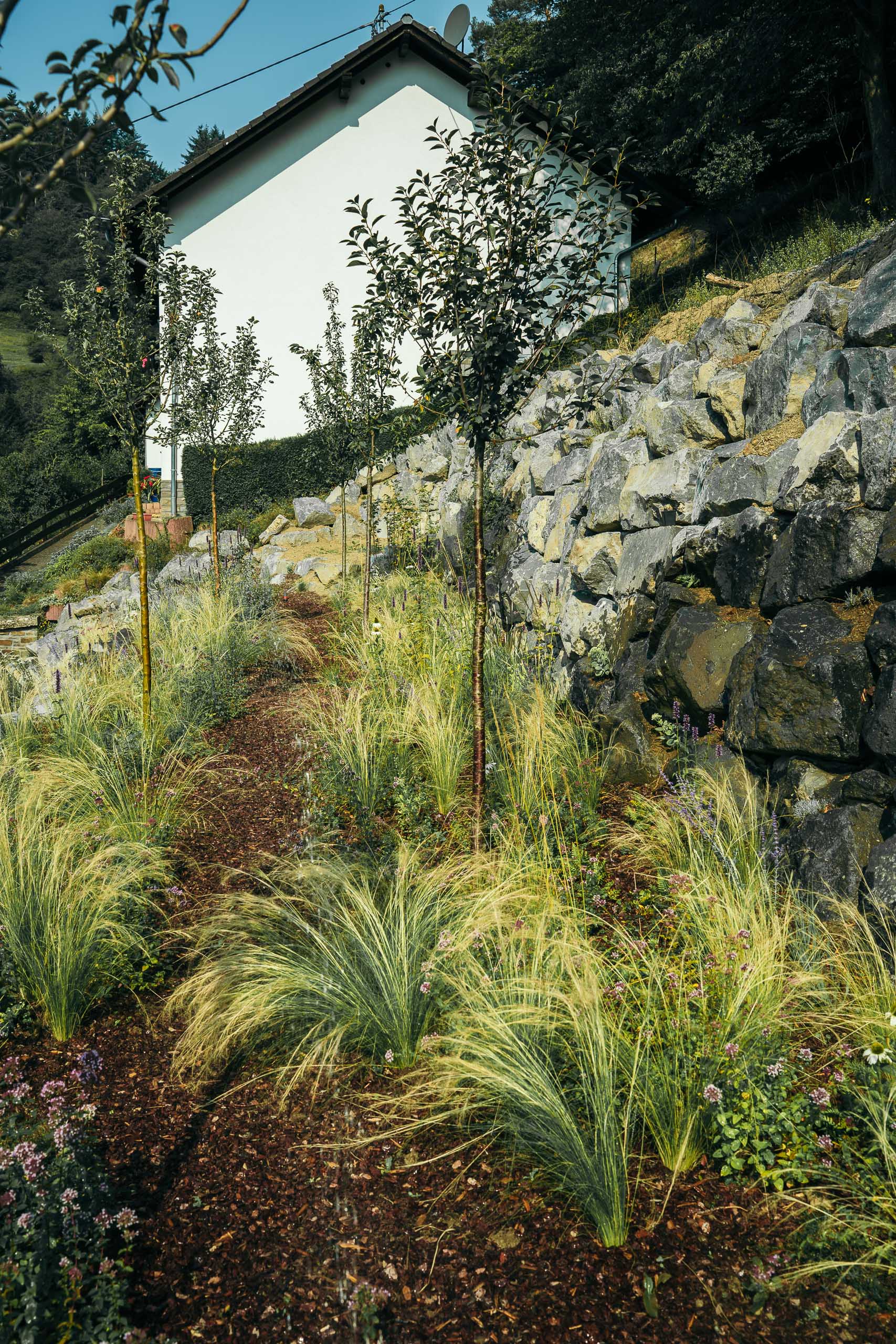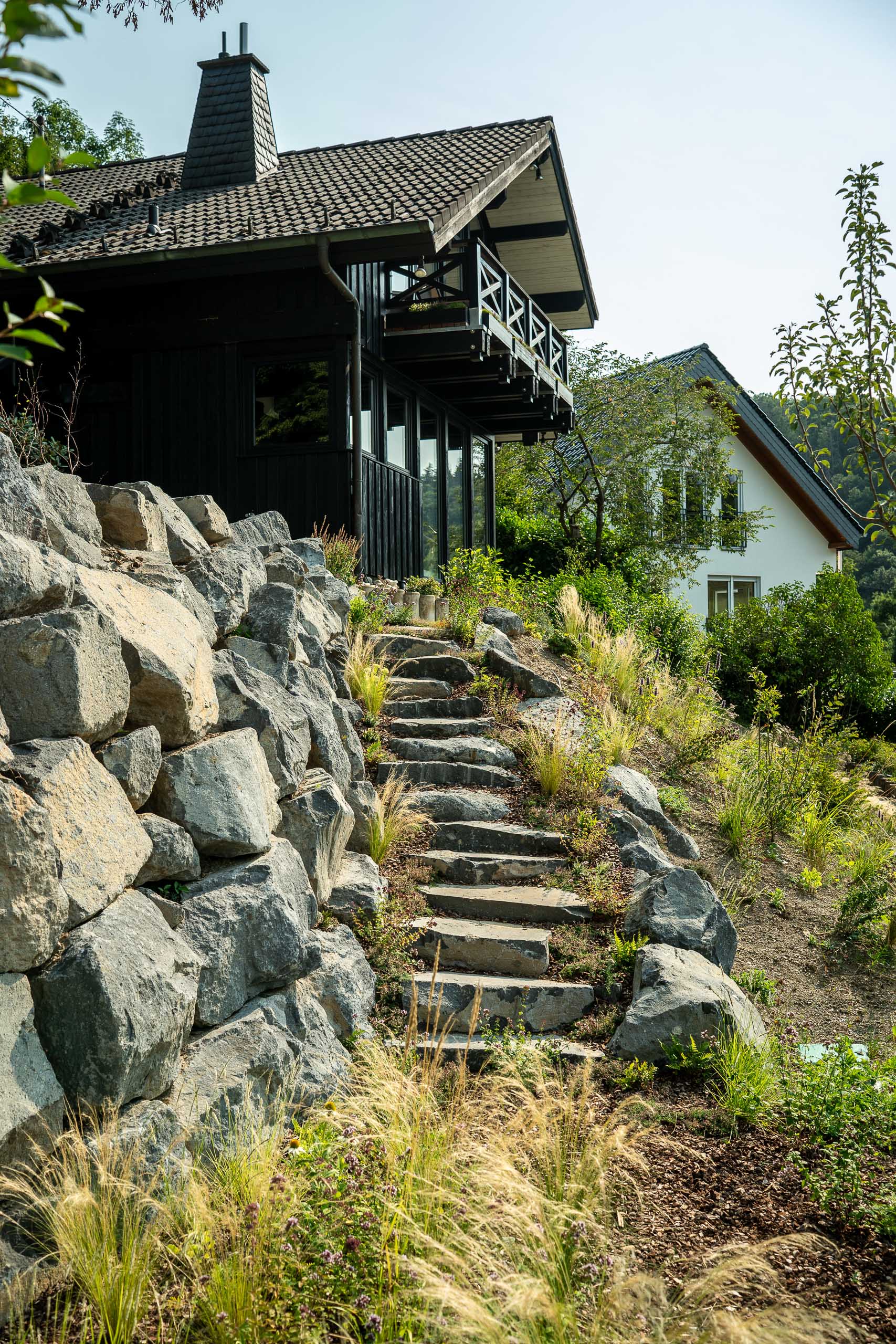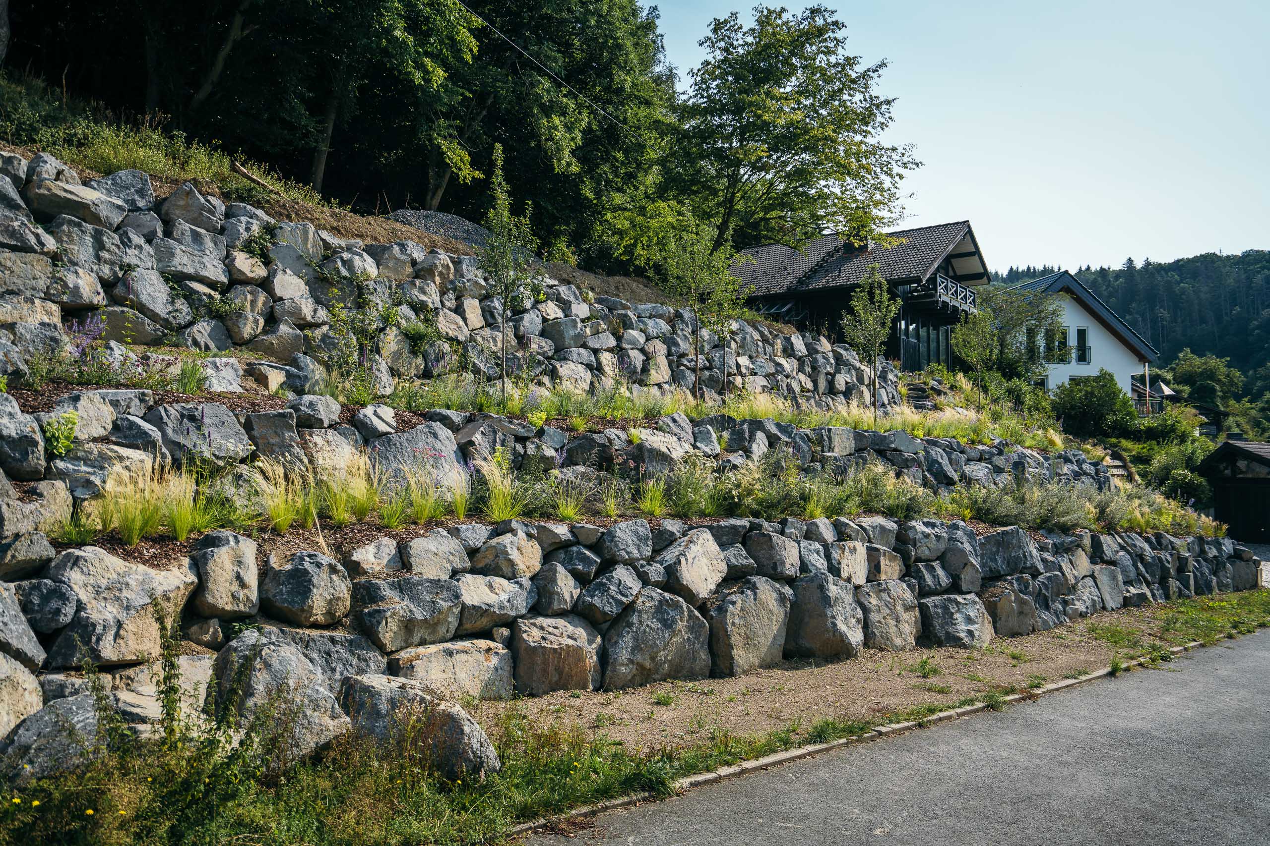 Um aus dem Hanggrundstück ein Maximum an nutzbarer Fläche zu gewinnen, wurde die Böschung in drei Ebenen terrassiert. Große Findlinge aus natürlichem Basalt, die ohne Betoneinsatz in traditioneller Trockenmauerbauweise versetzt wurden, sichern die Terrassen zuverlässig und verhindern ein Abrutschen oder Ausspülen der Böschung.