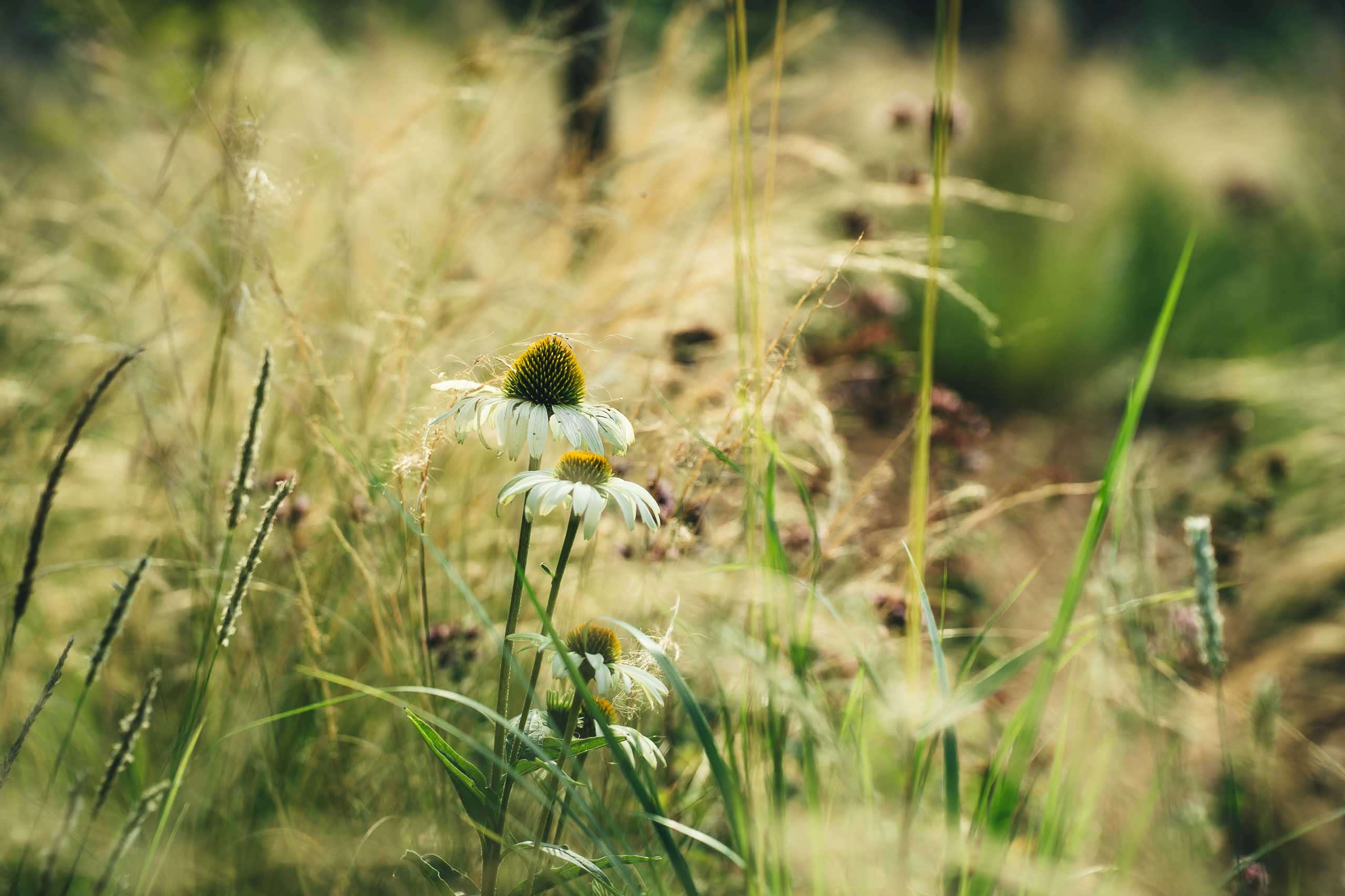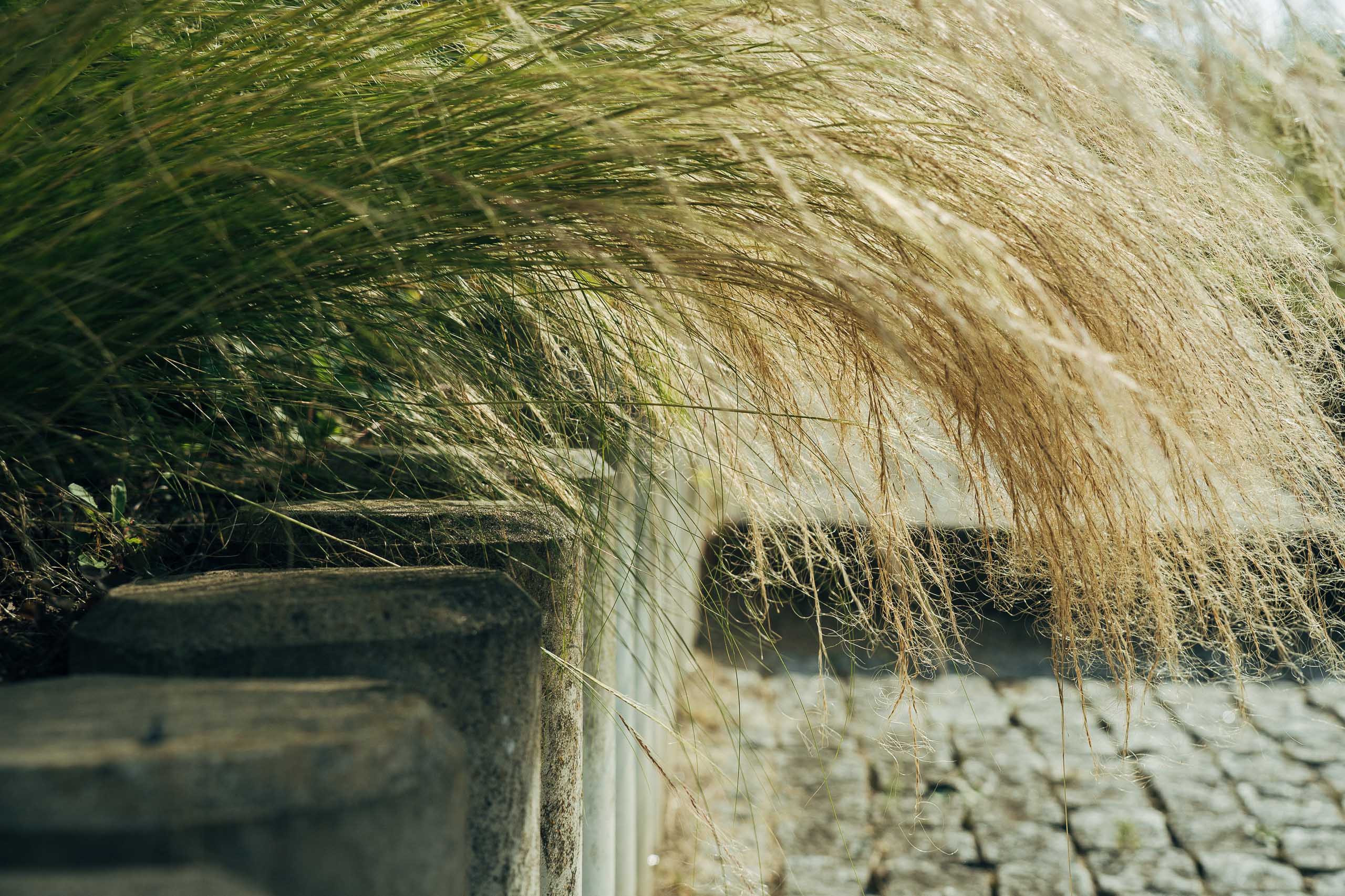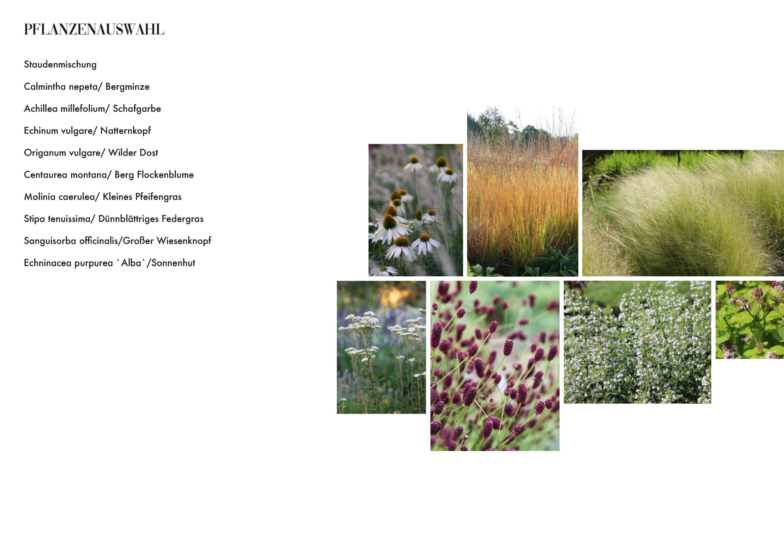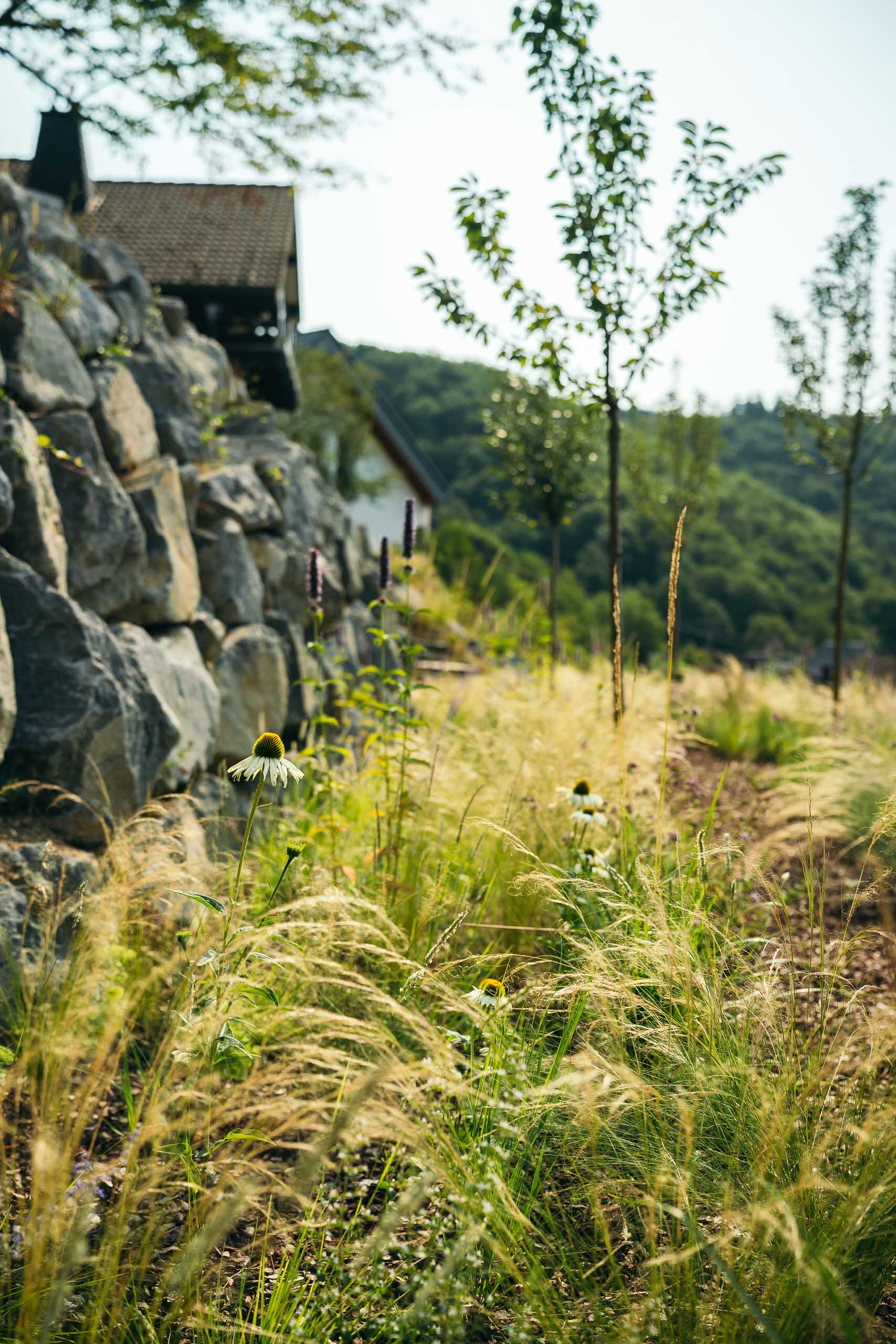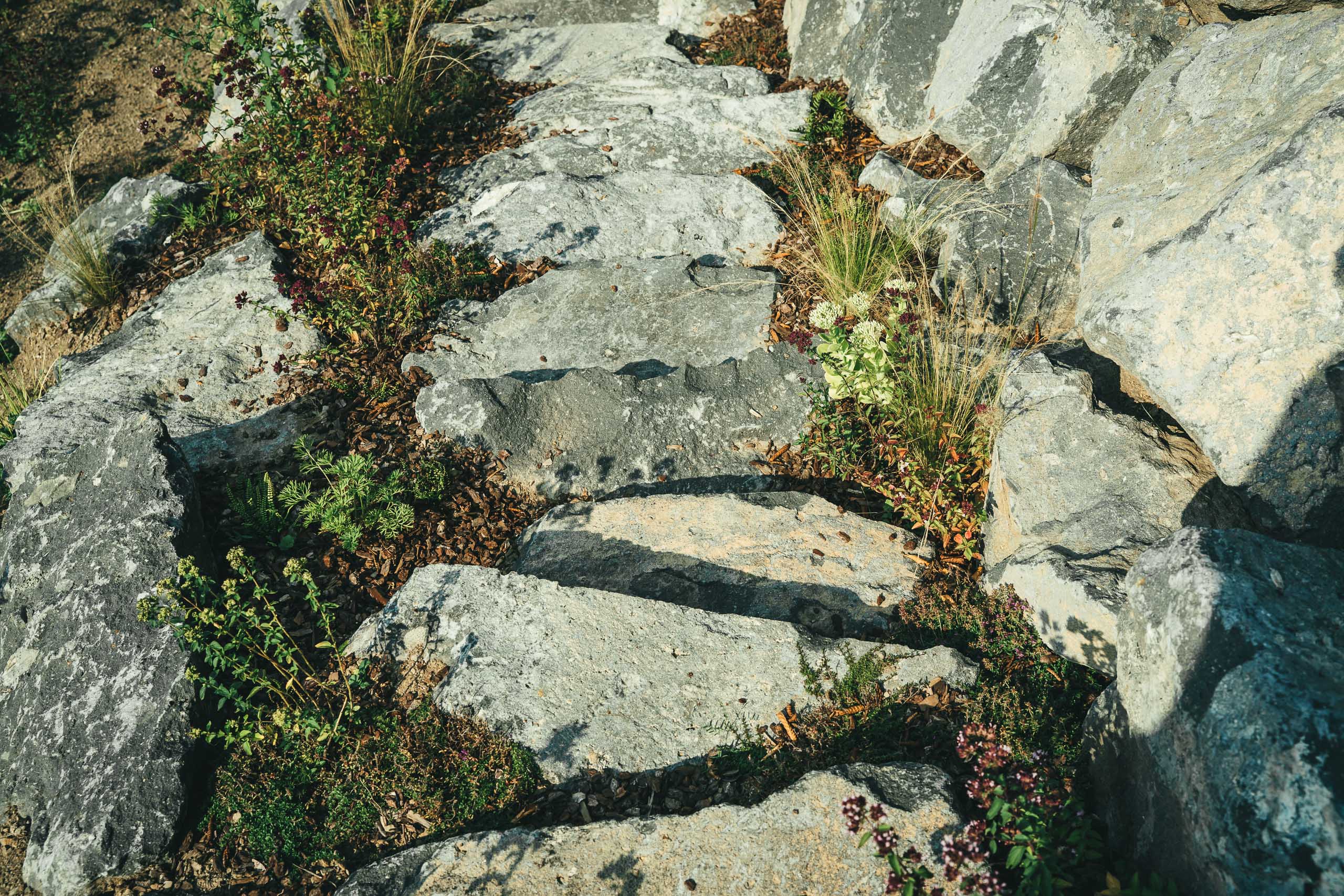 Da bei diesem Projekt keineswegs nur der Stein im Vordergrund stehen sollte, wurden alle Terrassenebenen, Hangflächen und sogar die Fugen der Findlingsmauer mit einer naturnahen Staudenmischung bepflanzt. Um mühsames Gießen in den steilen Böschungslagen zu vermeiden, wurde die Pflanzenauswahl bewusst sehr trockenheitsrobust zusammengestellt.